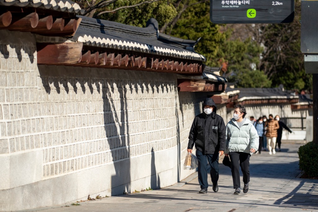 12月1日,行人佩戴口罩走在韩国首尔街头。(新华社记者王益亮摄)