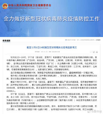【#12月8日新增新冠肺炎确诊病例83例# #12月8日新增本土病例60例#】据国家卫生健康委员会官方网站,12月8日0—24时,31个省(自治区、直辖市)和新疆生产建设兵团报告新增确诊病例83例。其中境外输入病例23例(广西9例,湖北4例,广东3例,上海2例,云南2例,天津1例,福建1例,陕西1例),含1例由无症状感染者转为确诊病例(在广东);本土病例60例(内蒙古42例,均在呼伦贝尔市;浙江12例,其中绍兴市9例、宁波市3例;黑龙江4例,均在哈尔滨市;江苏1例,在南京市;云南1例,在德宏傣族景颇族自治州)。无新增死亡病例。无新增疑似病例。