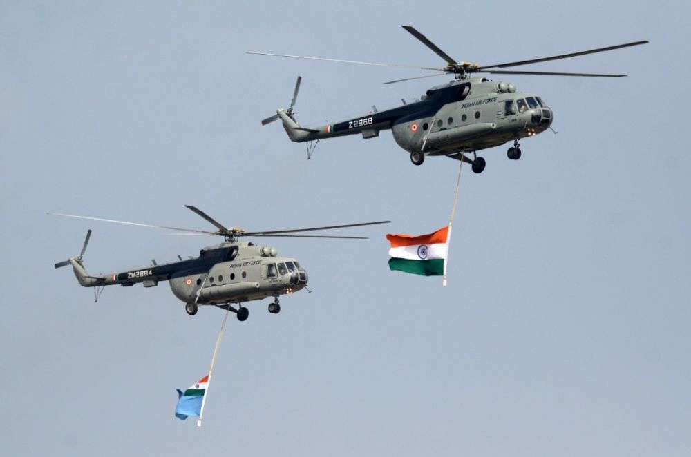 2月3日,在印度班加罗尔耶拉汉卡空军基地,直升机参加印度航空展开幕表演。(新华社发)