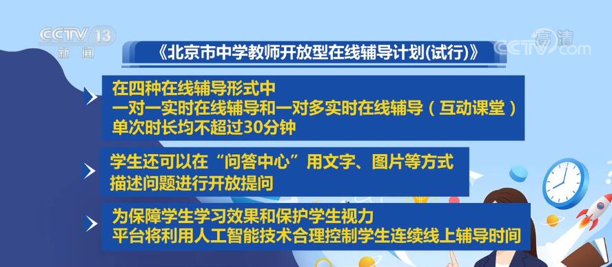 根据《计划》实施步骤,从2022年起,除节假日和寒暑假外,周一至周五每天18时至21时,北京市所有初中学生都可享受在线辅导服务,辅导学科涵盖语文、数学、英语等9门。在四种在线辅导形式中,一对一实时在线辅导和一对多实时在线辅导(互动课堂)单次时长均不超过30分钟。同时,学生还可以在“问答中心”用文字、图片等方式描述问题进行开放提问。此外,为保障学生学习效果和保护学生视力,平台将利用人工智能技术合理控制学生连续线上辅导时间。