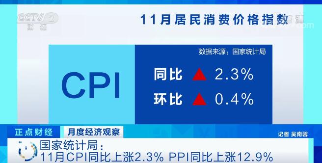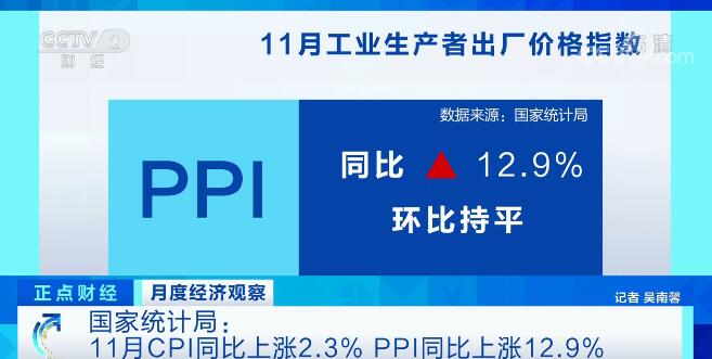 央视网消息:国家统计局最新发布,11月份,全国居民消费价格指数CPI同比上涨2.3%,环比上涨0.4%。11月份,全国工业生产者出厂价格PPI同比上涨12.9%,环比持平。
