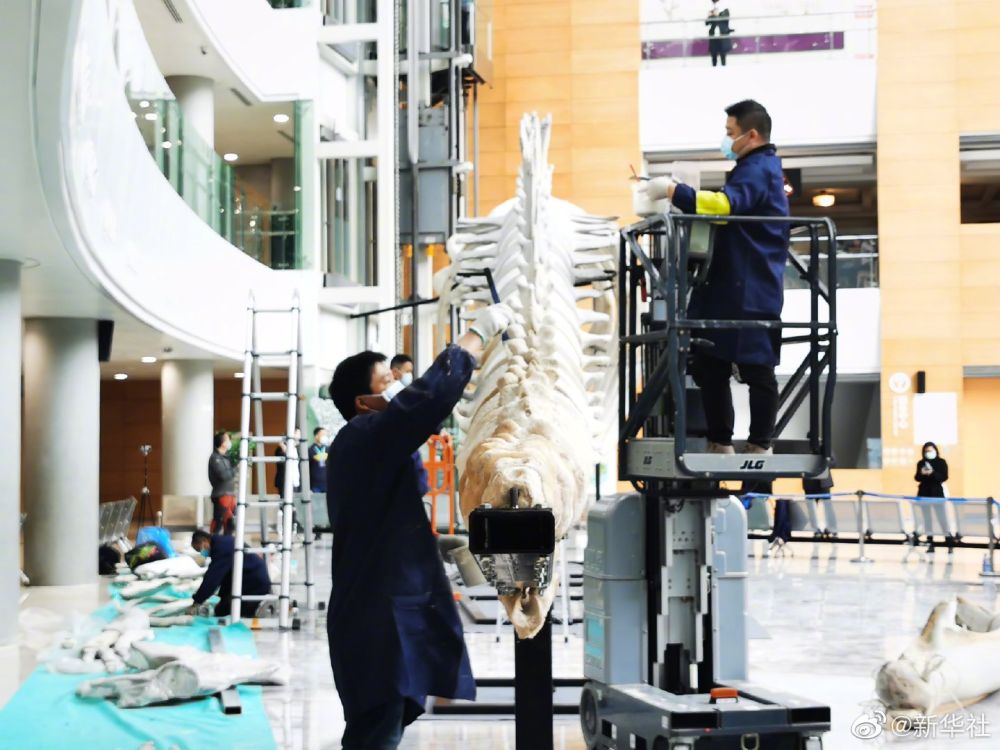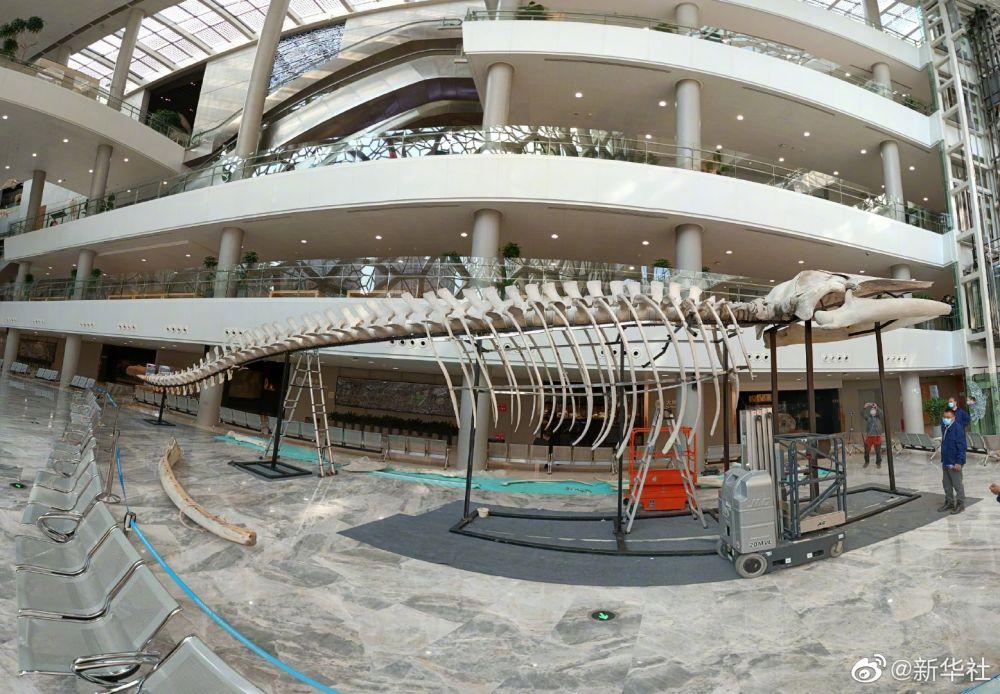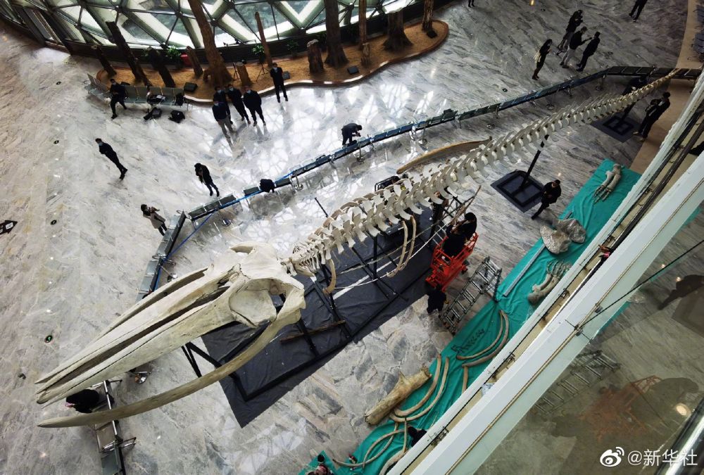 【搁浅死亡的长须鲸标本在上海自然博物馆亮相】2017年3月在上海发现搁浅死亡的雄性长须鲸,经过生物降解去肉、去脂处理等程序,成为标本,9日在上海自然博物馆(上海科技馆分馆)亮相。这副标本长约24米,重量达3吨,共由约200块骨骼组成。(记者陈爱平、方喆)