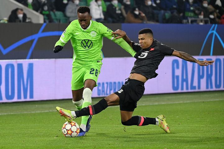 12月8日,里尔队球员雷尼尔多(右)在比赛中与沃尔夫斯堡队球员卢克巴基奥拼抢。新华社发(乌尔里希·胡夫纳格尔 摄)
