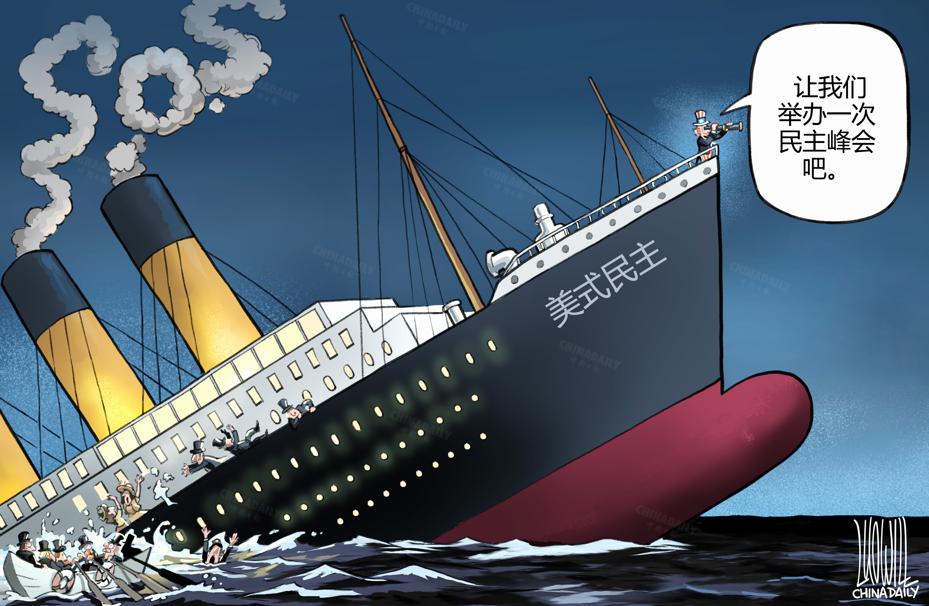 美式民主是泰坦尼克号,明明要沉了,还要举办“民主峰会”。(漫画作者:中国日报美术部 罗杰)