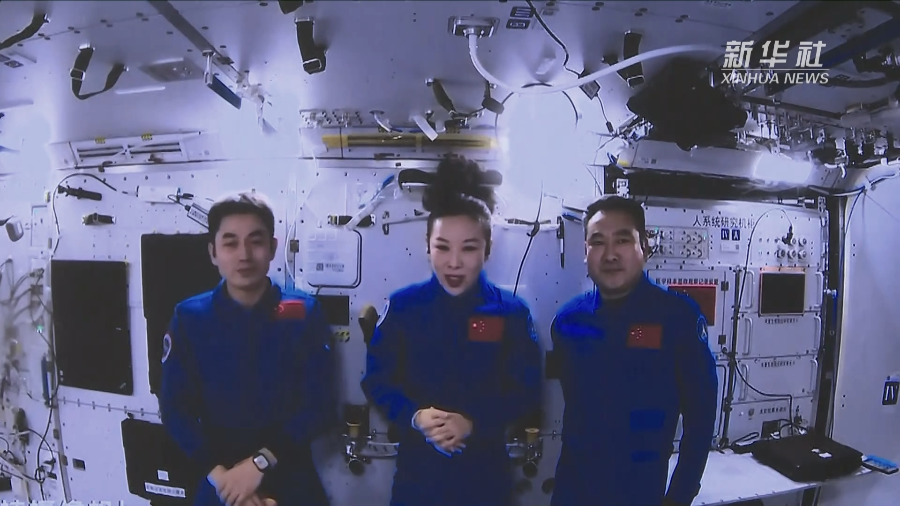 12月9日,神舟十三号乘组航天员翟志刚、王亚平、叶光富在空间站进行太空授课。