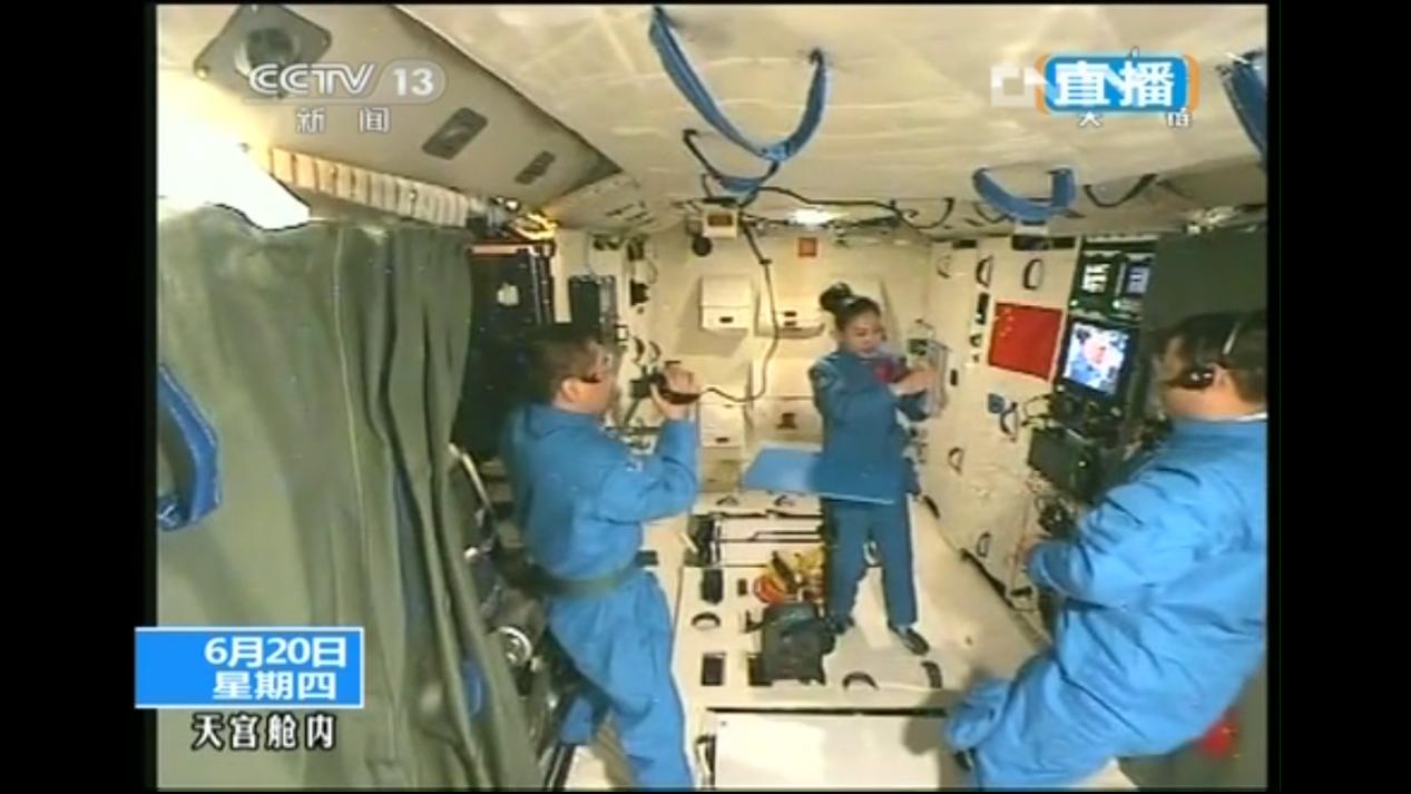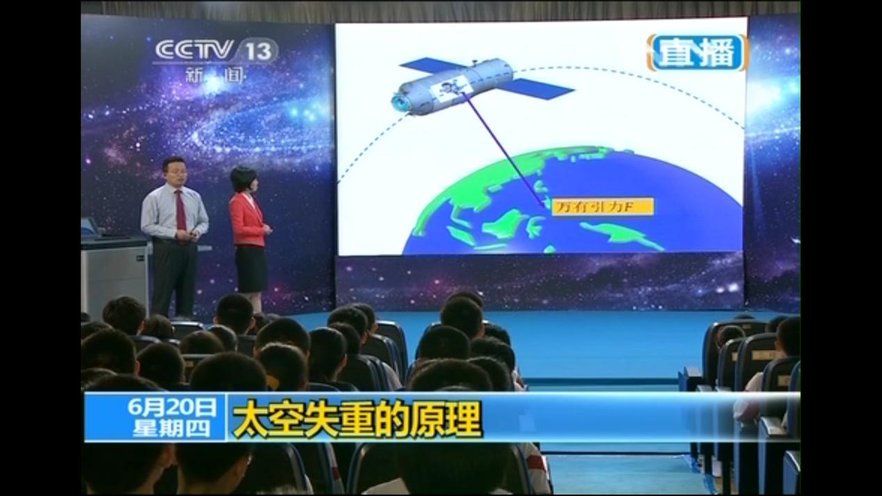2013年6月20日,中央电视台第一次进行了“太空授课”直播,从早上8点半开始,在中央电视台新闻频道、综合频道并机播出了特别节目《太空新旅天宫课堂》。特别节目设立了演播室,主持人与专家在演播室完成了“太空授课”的相关话题,并通过视频直播连线了北京飞控中心、人民大学附中地面课堂。