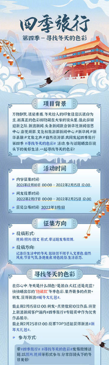【快来一起寻找冬天的色彩!】真正的色彩就隐藏在大家的镜头里!新华社新闻信息中心、音视频部、@新华网 @新华县融 联合文化和旅游部新闻中心 @文旅之声 @自然资源部 @新浪新闻 @头条新闻 ,共同发起#四季旅行#第四季#寻找冬天的色彩#活动,参与话题晒出你镜头下的美好生活!戳链接>> 四季旅行-寻找冬天的颜色 等你来打卡~更有@微博校园 @微天下 特别参与~