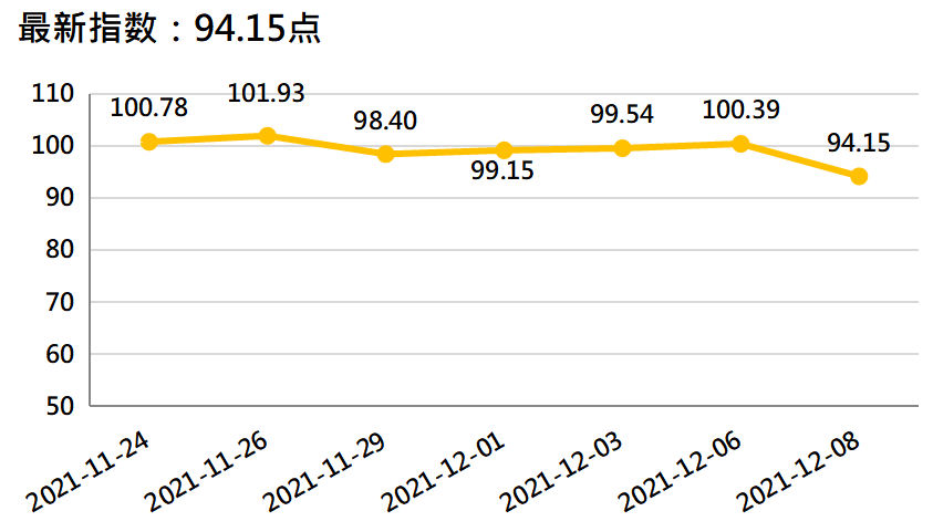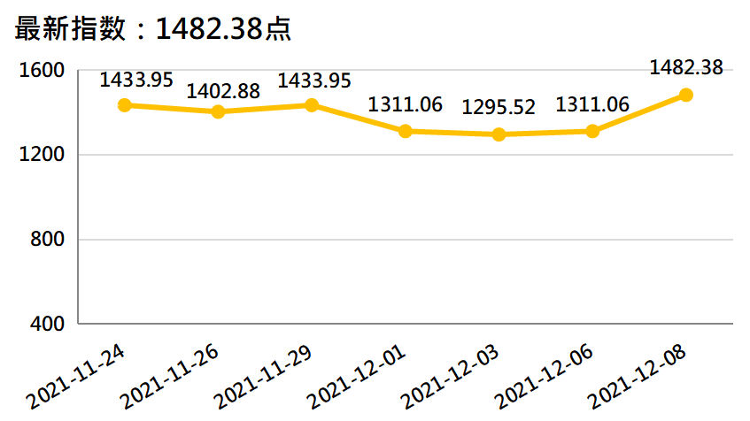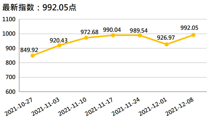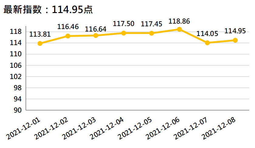 数据显示,截至12月8日,国内香蕉产地价格指数报94.15点,较上一发布日(12月1日,下同)99.15点下跌5.04%;香蕉销地批发价格指数报114.95点,较上一发布日113.81点上涨1.00%;进口蕉价格指数报992.05点,较上一发布日926.97点上涨7.02%;皇帝蕉产地价格指数报1482.38点,较上一发布日1311.06点上涨13.07%。