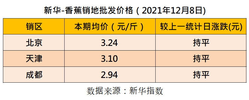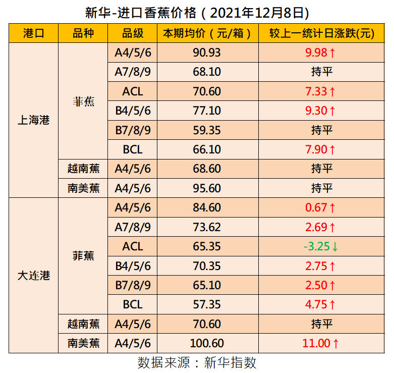 新华指数分析师指出,本监测期内(12月2日-12月8日),由于产区货源紧俏,客商询价补货积极,本期国内香蕉产地价格指数小幅调整,但产区行情整体依旧保持较高位。销地批发市场方面,香蕉消费渐旺,叠加产区香蕉行情持续高位,销地批发市场蕉价高企,本期香蕉销地批发价格指数环比上涨。进口蕉方面,受国产蕉产地供应减少及行情较好影响,进口批发商提高预期,本期进口蕉港口报价环比上涨。皇帝蕉方面,市场需求增加,产地供货量有限,本期皇帝蕉产地行情大幅上涨。