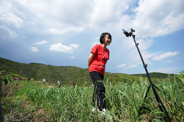 ▲在山西省黎城县岩井村的谷子地里,魏美玲通过网络直播介绍小米生长情况。怀着发展现代农业的梦想,在城市里工作多年的魏美玲回到家乡创业做起了职业农民,成为太行山上的“新农人”。她创办合作社种植小米,从无到有,逐渐壮大,几年时间,种植面积已超过2000亩,带动平顺县、黎城县500多户村民就业增收,成为当地小有名气的“谷子大王”。