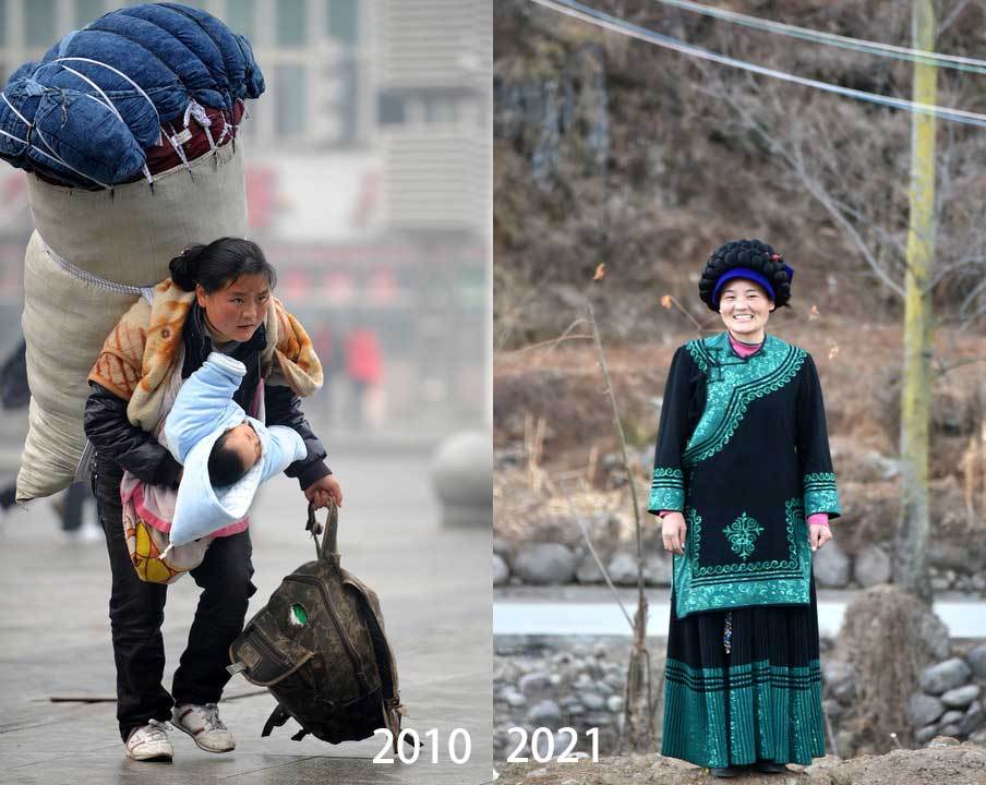 ▲感动亿万国人的“春运母亲”巴木玉布木。2010年1月30日,新华社记者周科在江西南昌火车站广场拍下这样一张照片:一位年轻母亲背上的巨大行囊压弯了她的身躯,手里的背包眼看拖地,但揽在右臂中的婴孩整洁而温暖。抬头前行的年轻母亲面色红润,一双大眼睛坚定有力。这张名为《孩子,妈妈带你回家》的照片编发后,在海量春运照片中直击人心。2014年,巴木玉布木家被列为建档立卡贫困户。2019年,巴木玉布木家盖起新房。2020年,她家年收入达到10万元,成功实现脱贫。