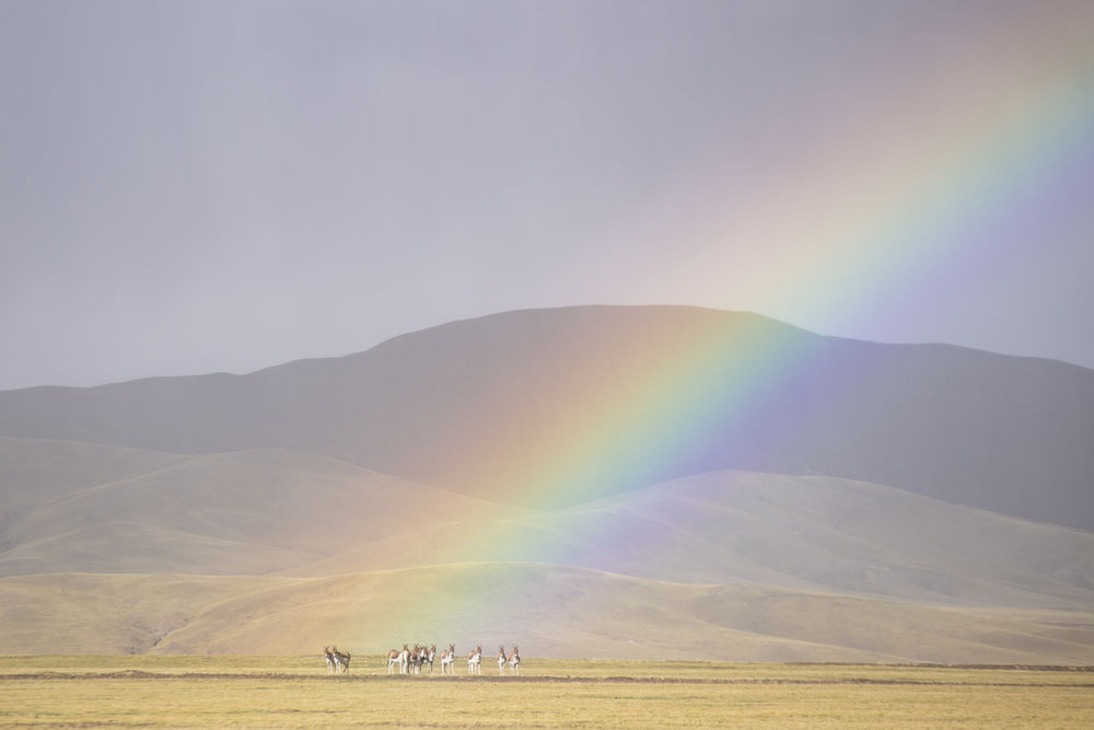 ▲在羌塘国家级自然保护区拍摄的彩虹之下的藏野驴。