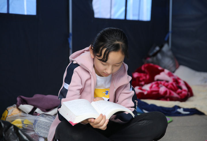▲在云南大理白族自治州漾濞县,一名学生在救灾帐篷内看书。此前一天晚间,当地发生6.4级地震。