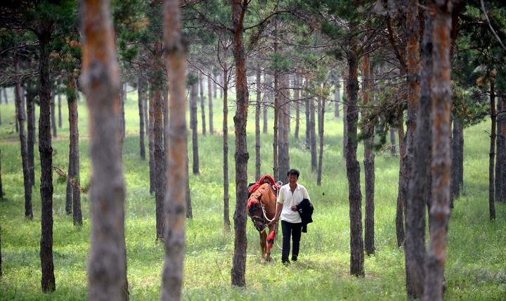 ▲辽宁省彰武县阿尔乡林场护林员李东魁在森林中巡查。一匹老马、一个水壶,退伍军人李东魁1987年到章古台林场阿尔乡护林点当护林员,在没水没电的环境里看护8500亩樟子松林,每天至少巡山13个小时,一干就是30多年。累了,就靠在树下打个盹;饿了,掏出干粮就凉水吃几口;闷了,站在沙坨子上喊几声,唱一唱记忆里的军歌。以马为伴,以山为家,在李东魁守护的34年间,无一次森林火灾。妻子病了、房子漏雨,甚至女儿的婚礼,他都顾不上,李东魁说:“树起来了,咱给守住了,值!”