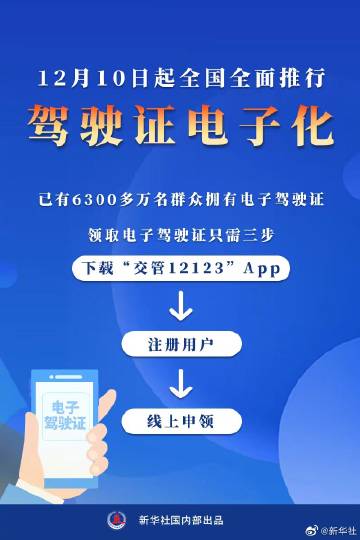【#驾驶证电子化今起全国推广##已有6300多万人拥有电子驾驶证#】记者10日从公安部获悉,今起全国全面推行驾驶证电子化,目前各地公安交管部门已通过全国统一的“交管12123”App为6300多万名群众核发电子驾驶证。10日当天,共为390多万名群众核发电子驾驶证。电子驾驶证在全国范围内有效,为驾驶人以及相关行业和管理部门提供“亮证”“亮码”服务。电子驾驶证的领取只需三步:下载“交管12123”App、注册用户、线上申领。(记者任沁沁,海报设计杨轶群)