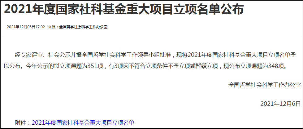据悉,国家社会科学基金重大项目是我国哲学社会科学领域层次最高、资助力度最大、关注度最高、最具学术权威的政府资金资助项目,具有重要的导向性、权威性和示范作用,是衡量哲学社会科学研究机构科研综合实力和核心竞争力的关键指标。2021年度国家社会科学基金重大项目共发布了335个招标选题,最终有348个项目获准立项。此次项目获批展示了我院科研创新能力持续发展的良好势头,标志着我院科研水平迈上了新台阶。