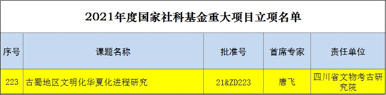 近日,全国哲学社会科学工作办公室公布了2021年度国家社科基金重大项目立项名单,四川省文物考古研究院申报的《古蜀地区文明化华夏化进程研究》课题获批立项(批准号:21&ZD223)。