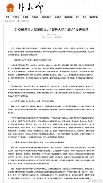 【外交部:#美国假民主之名行反民主之实#】12月11日,外交部发言人就美国举办“领导人民主峰会”发表谈话。全文链接如下:网页链接