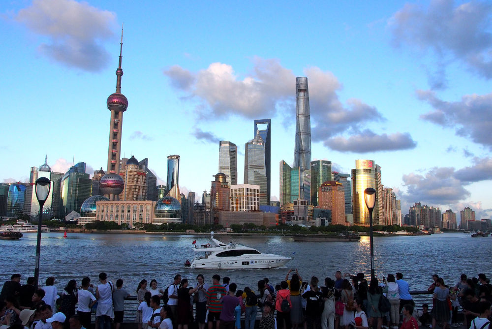 2019年8月2日,游客在外滩欣赏浦东陆家嘴景色。新华社记者陈飞摄