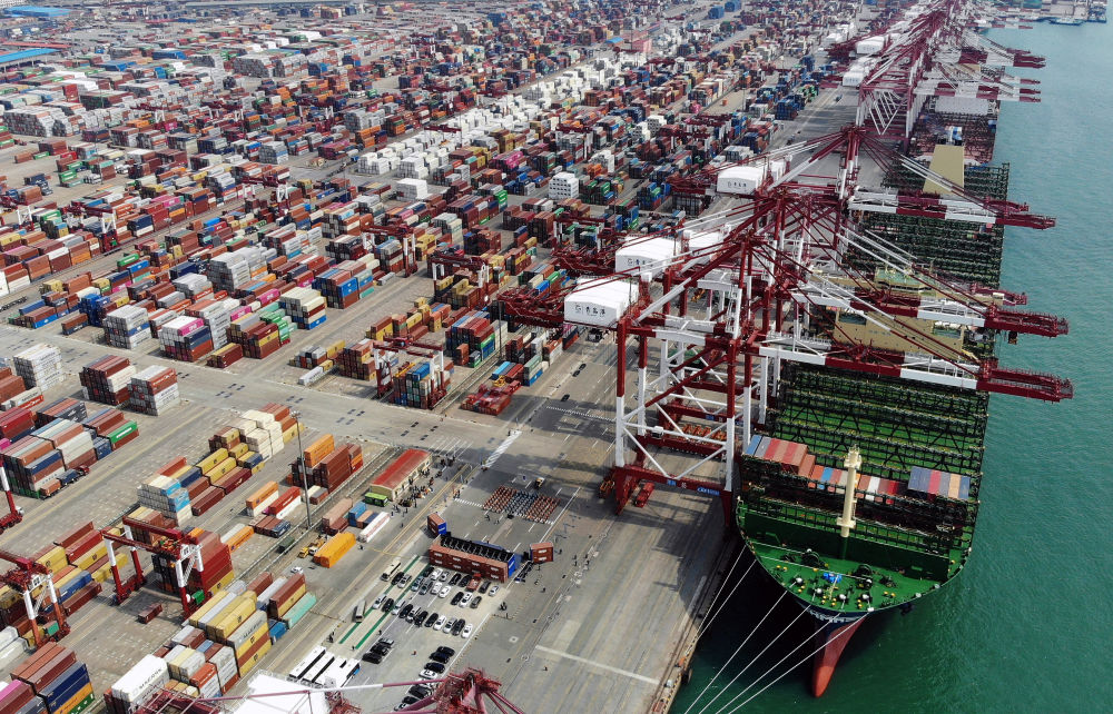 2020年4月26日,载箱量可达2.4万标准箱的“现代商船阿尔赫西拉斯”轮靠泊在青岛港前湾码头。新华社记者李紫恒摄