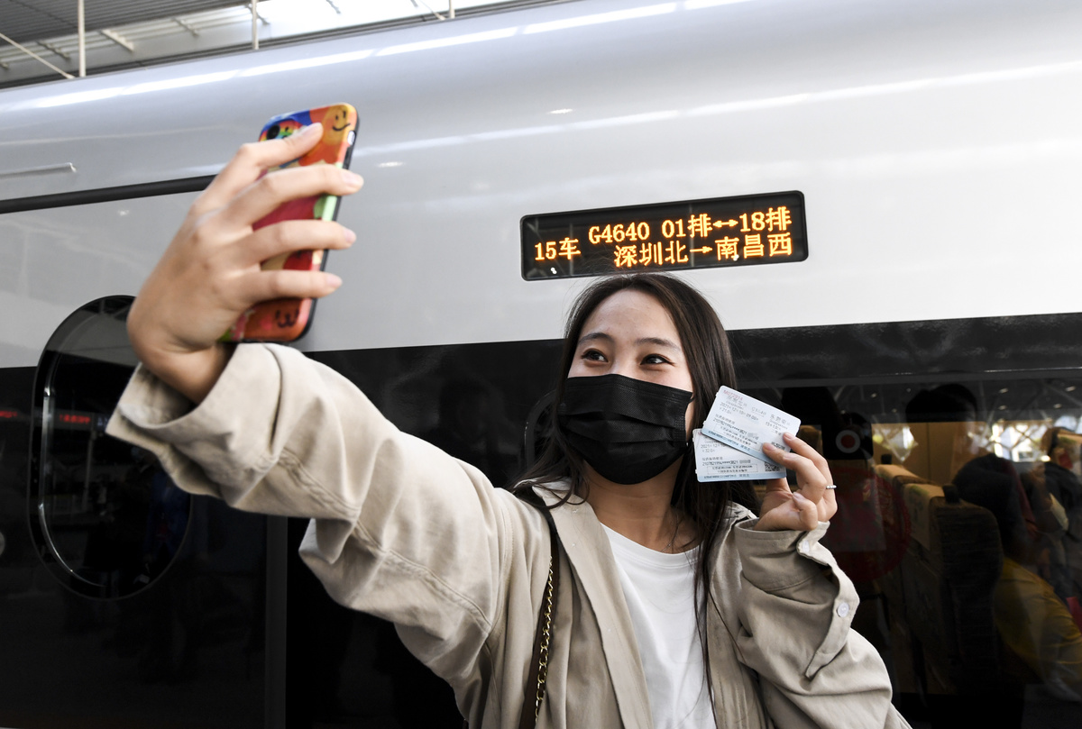 12月10日,乘客准备搭乘深圳北站开往南昌西站的首班列车时,在车厢外自拍留影。新华社记者 毛思倩 摄