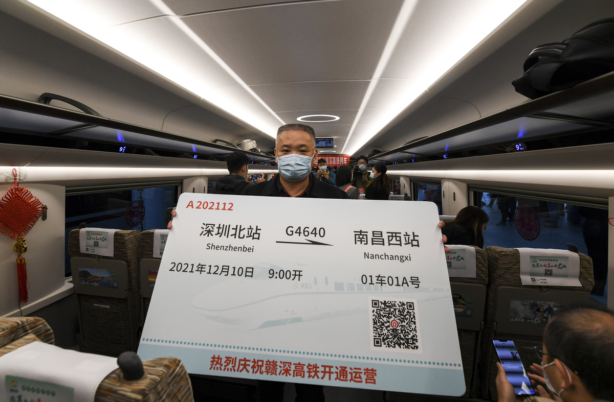 12月10日,乘客搭乘深圳北站开往南昌西站的首班列车时展示纪念车票。新华社记者 毛思倩 摄
