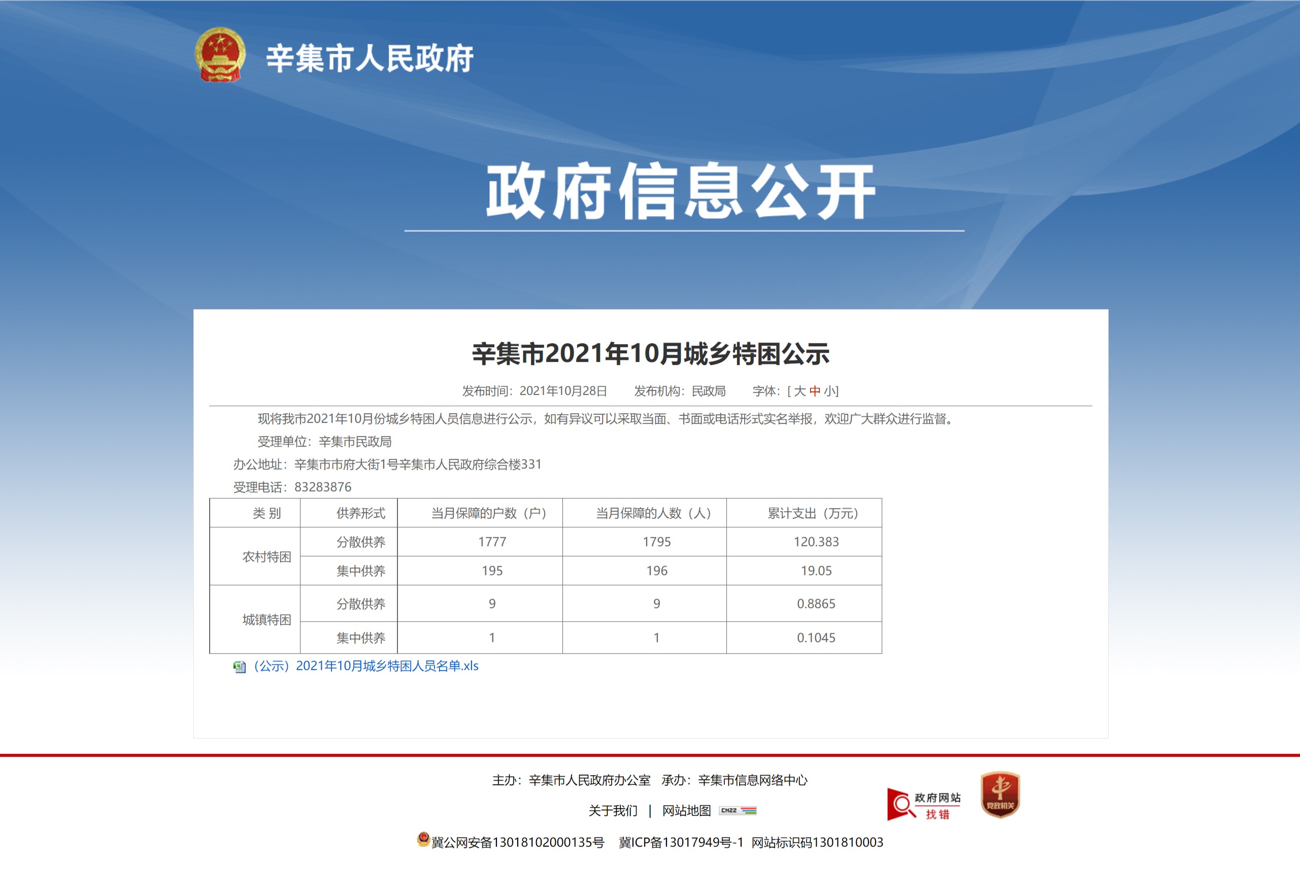 12月11日,澎湃新闻记者接到网友提供信息,河北省辛集市政府官网今年10月28日公布的一份《辛集市2021年10月城乡特困公示》,详细列出了了城乡特困人员所属的街道(乡镇)、社区、姓名、性别、详细身份证号、特困类别和每月供养金额。被公开个人信息的特困群众有2001人。