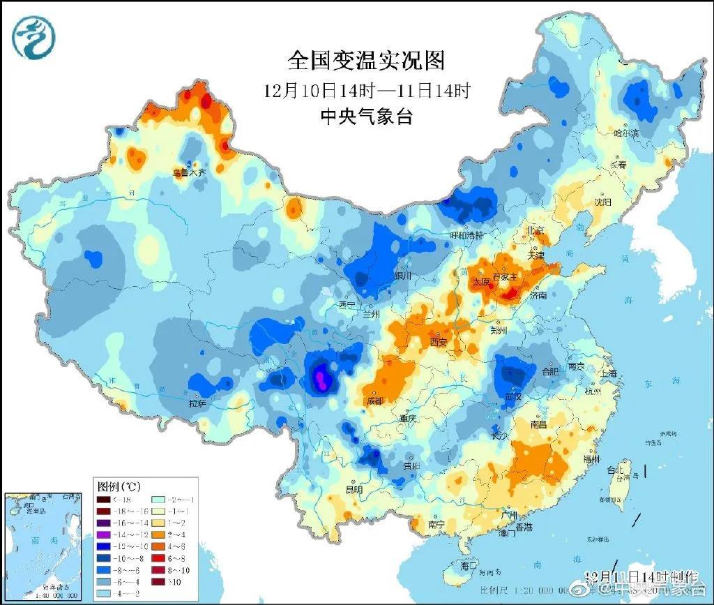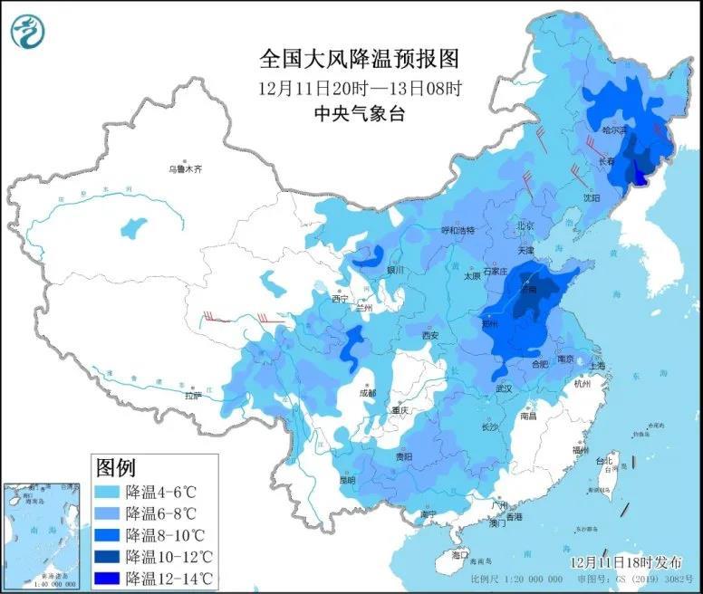 中央气象台预计,受冷空气影响,11日20时至13日08时,中东部地区气温将下降4℃~6℃,其中,东北地区中部、黄淮大部等地降温8℃~10℃,局地12℃以上;内蒙古中东部、东北地区、青海南部等地的部分地区有4~5级大风,阵风6~8级。下周一早晨冰冻线将推进至川陕交界、湖北北部至苏皖南部一带。