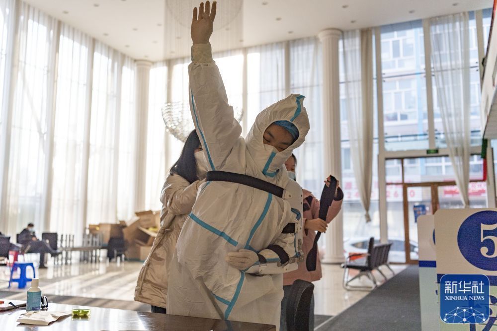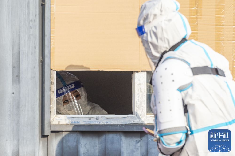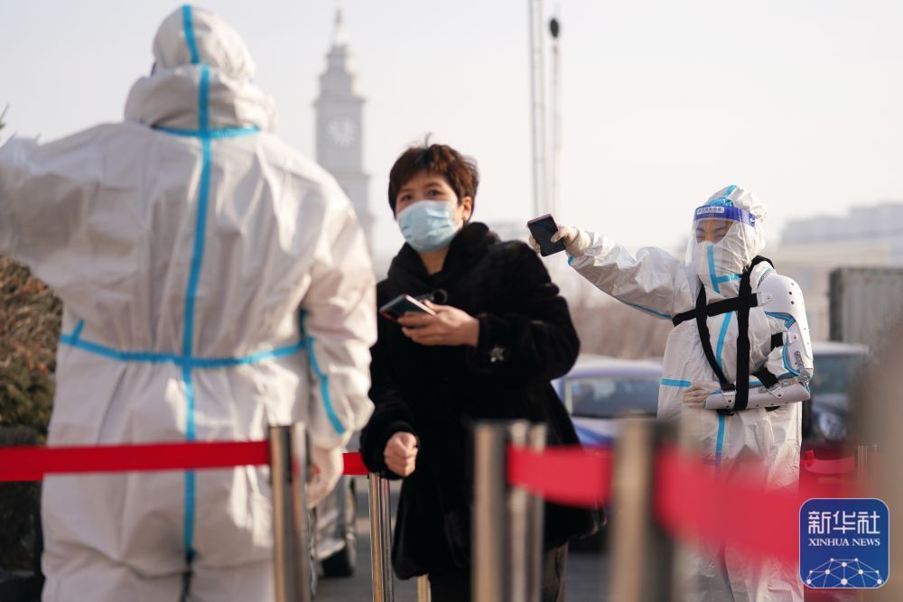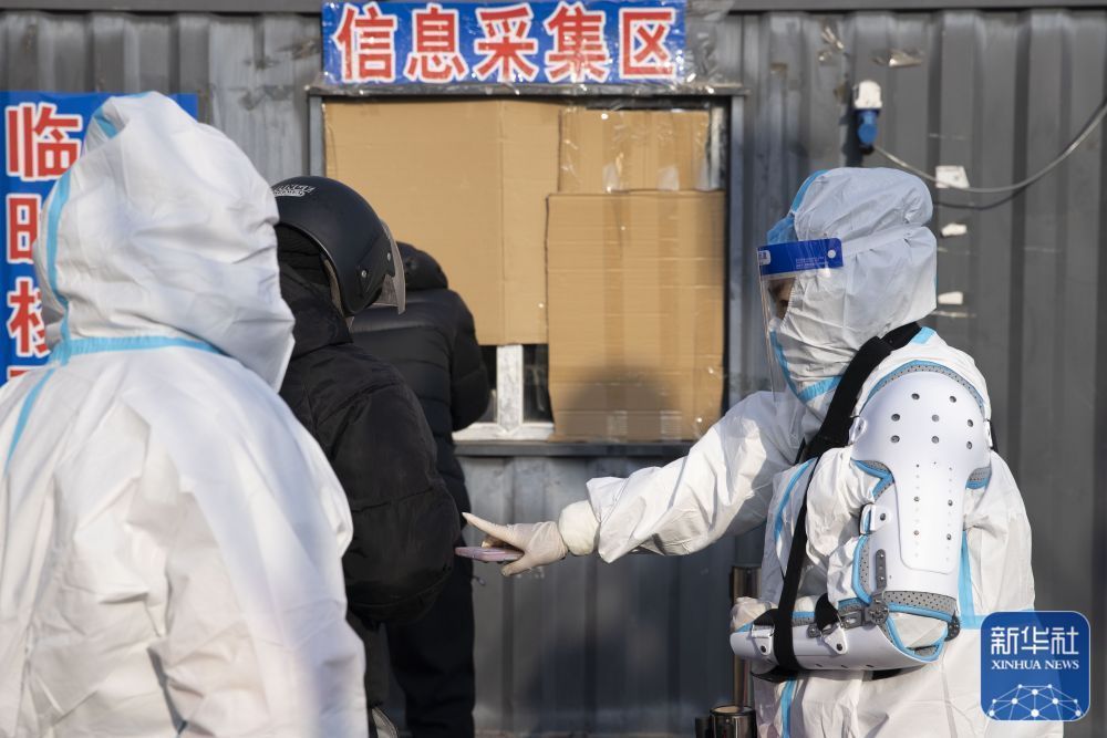 12月9日,在哈尔滨市松北区裕民街道志华社区一核酸检测点,李松竹(右二)引导市民有序检测。