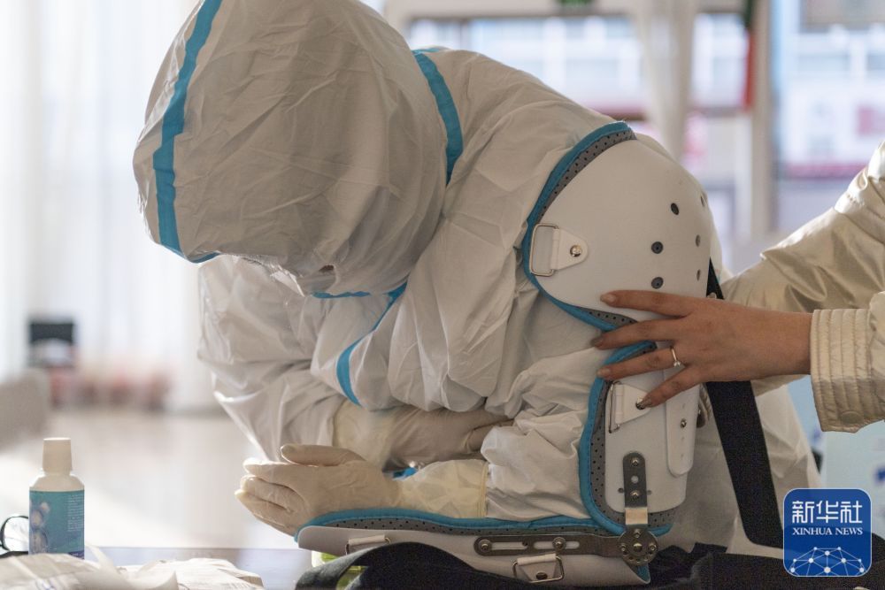 12月9日,在哈尔滨市松北区裕民街道志华社区,社区工作人员帮助李松竹给受伤的左臂佩戴外固定支具。