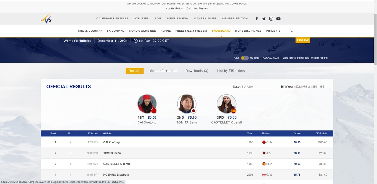 此外,2021/22赛季自由式滑雪世界杯芬兰卢卡站结束空中技巧混合团体决赛的争夺,由徐梦桃、孙佳旭和齐广璞组成的中国队以354.87分的成绩夺冠,连续两站比赛登上最高领奖台。
