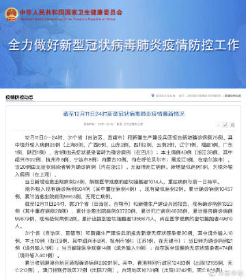 【#12月11日新增新冠肺炎确诊病例75例# #12月11日新增本土病例49例#】据国家卫生健康委员会官方网站,12月11日0—24时,31个省(自治区、直辖市)和新疆生产建设兵团报告新增确诊病例75例。其中境外输入病例26例(上海8例,广西8例,山东2例,四川2例,云南2例,辽宁1例,福建1例,广东1例,陕西1例),含1例由无症状感染者转为确诊病例(在四川);本土病例49例(浙江38例,其中绍兴市22例、杭州市8例、宁波市8例;内蒙古10例,均在呼伦贝尔市;黑龙江1例,在哈尔滨市),含20例由无症状感染者转为确诊病例(均在浙江)。无新增死亡病例。新增疑似病例1例,为境外输入病例(在上海)。