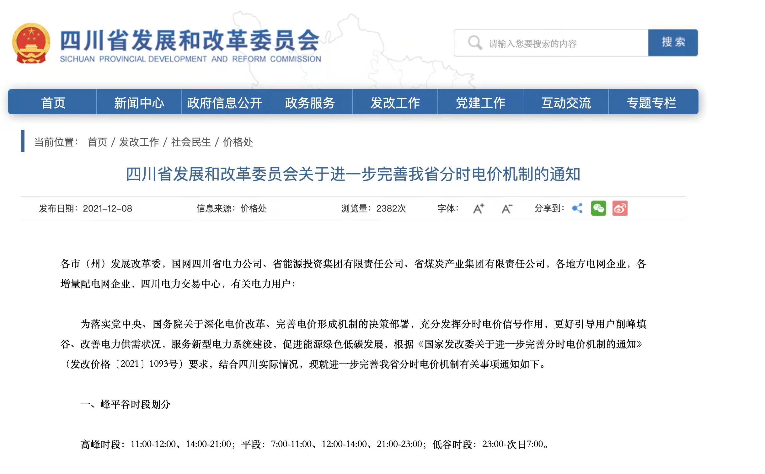 据四川省发改委网站消息,四川省发改委近日印发《关于进一步完善我省分时电价机制的通知》(以下简称《通知》),进一步明确了全省分时电价的执行范围、方式、浮动比例以及建立尖峰电价机制。该通知自2022年1月1日起执行。