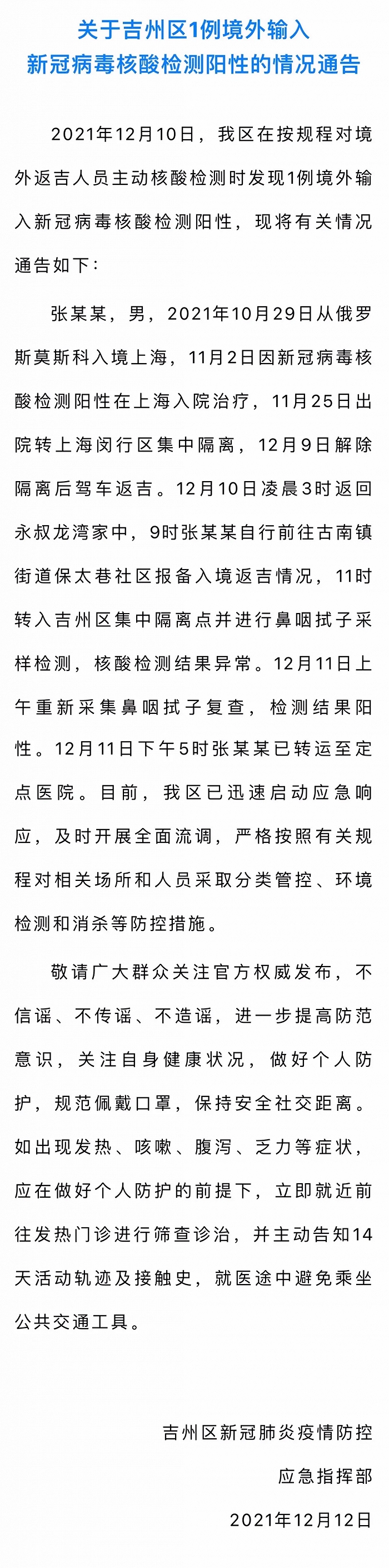 张某某,男,2021年10月29日从俄罗斯莫斯科入境上海,11月2日因新冠病毒核酸检测阳性在上海入院治疗,11月25日出院转上海闵行区集中隔离,12月9日解除隔离后驾车返吉。12月10日凌晨3时返回永叔龙湾家中,9时张某某自行前往古南镇街道保太巷社区报备入境返吉情况,11时转入吉州区集中隔离点并进行鼻咽拭子采样检测,核酸检测结果异常。12月11日上午重新采集鼻咽拭子复查,检测结果阳性。12月11日下午5时张某某已转运至定点医院。目前,吉州区已迅速启动应急响应,及时开展全面流调,严格按照有关规程对相关场所和人员采取分类管控、环境检测和消杀等防控措施。