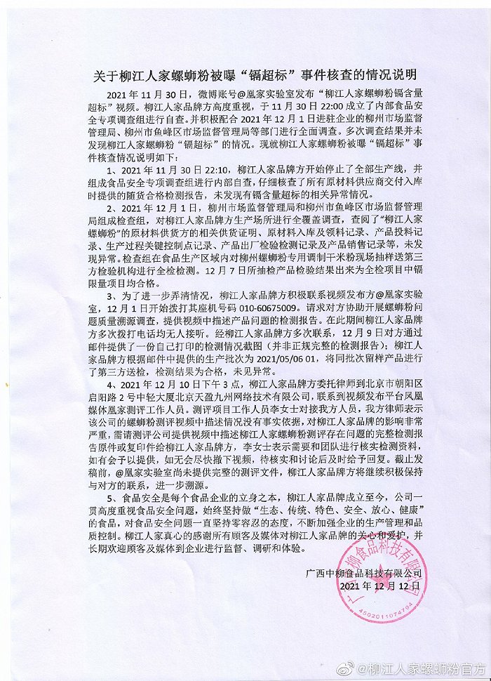 12月12日,@柳江人家螺蛳粉官方 微博发布情况说明回应“螺蛳粉镉超标”事件,品牌方称,被曝“镉超标”后,已于当日22:10停止全部生产线,并组成食品安全专项调查组进行内部自查,未发现有镉含量超标的相关异常情况。在配合柳州市场监督管理局、柳州市鱼峰区市场监督管理局等部门进行全面调查后,多次调查结果并未发现柳江人家螺蛳粉“镉超标”的情况。
