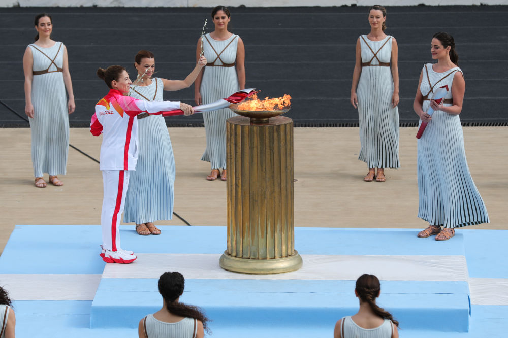 10月19日,北京冬奥会火种完成交接,图为火炬传递的最后一棒火炬手,希腊越野滑雪和冬季两项运动员帕拉斯凯维·亚多普卢点燃圣火盆。新华社记者郑焕松摄