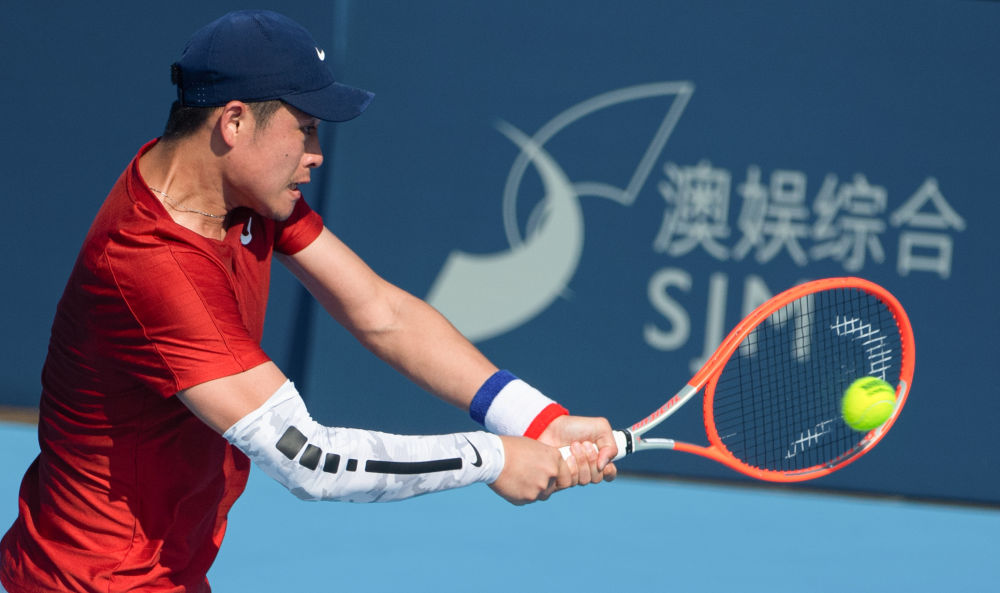 12月12日,在2021中国网球巡回赛职业级总决赛(澳门)暨全国网球单项锦标赛男子单打决赛中,吴易昺以2比0战胜特日格乐,夺得冠军。新华社记者张金加摄