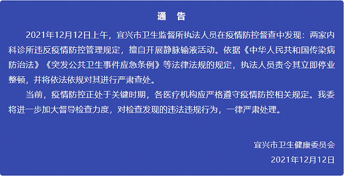 据“宜兴发布”消息,12月12日上午,宜兴市卫生监督所执法人员在疫情防控督查中发现:两家内科诊所违反疫情防控管理规定,擅自开展静脉输液活动。依据《中华人民共和国传染病防治法》《突发公共卫生事件应急条例》等法律法规的规定,执法人员责令其立即停业整顿,并将依法依规对其进行严肃查处。