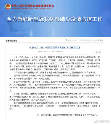 截至12月12日24时,据31个省(自治区、直辖市)和新疆生产建设兵团报告,现有确诊病例1381例(其中重症病例27例),累计治愈出院病例93763例,累计死亡病例4636例,累计报告确诊病例99780例,现有疑似病例2例。累计追踪到密切接触者1361008人,尚在医学观察的密切接触者51333人。