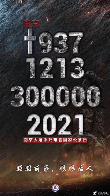 #1213300000#【#2021国家公祭日#】国行公祭,祀我殇胞。2021年12月13日,是第8个南京大屠杀死难者国家公祭日。昭昭前事,惕惕后人!此刻,转发微博,线上祭奠30万罹难同胞。#我们为什么铭记今天#