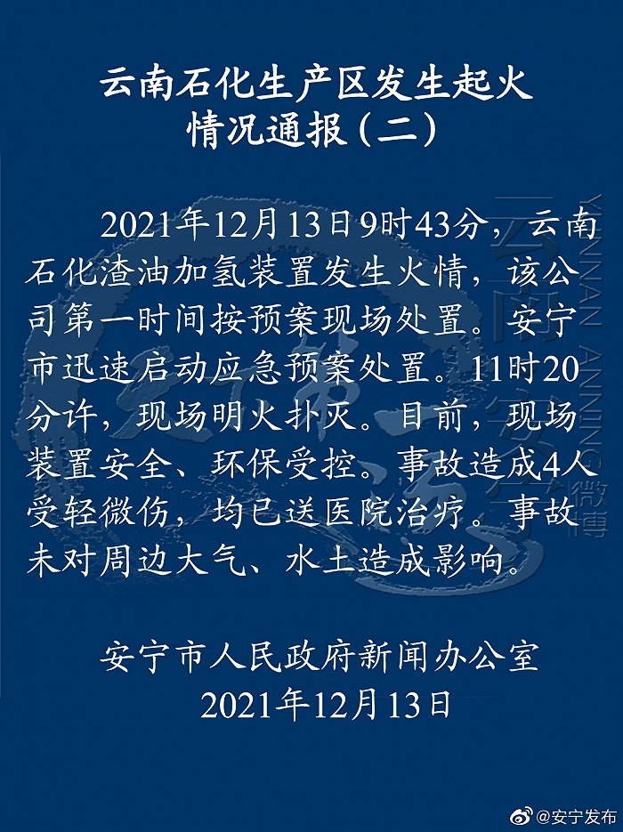据@安宁发布 消息,12月13日9时43分,云南石化渣油加氢装置发生火情,该公司第一时间按预案现场处置。安宁市迅速启动应急预案处置。11时20分许,现场明火扑灭。目前,现场装置安全、环保受控。事故造成4人受轻微伤,均已送医院治疗。事故未对周边大气、水土造成影响。