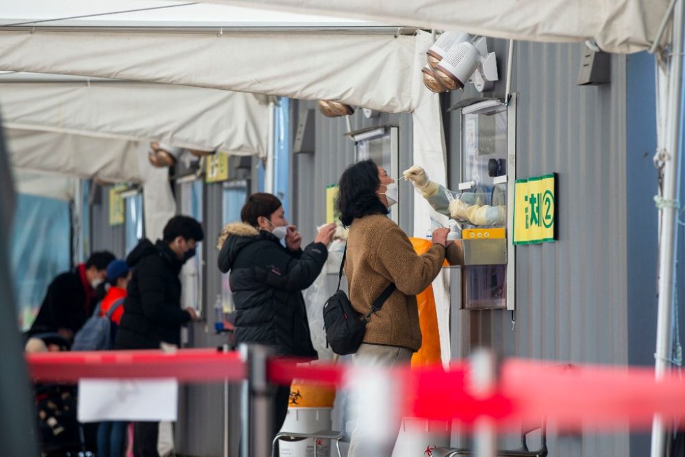 12月11日,在韩国首尔广场新冠检测点,民众接受核酸采样。(新华社记者王益亮摄)