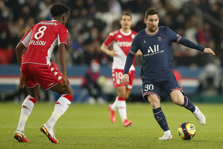 12月12日,巴黎圣日耳曼队球员梅西(右)与摩纳哥队球员琼阿梅尼在比赛中拼抢。新华社发