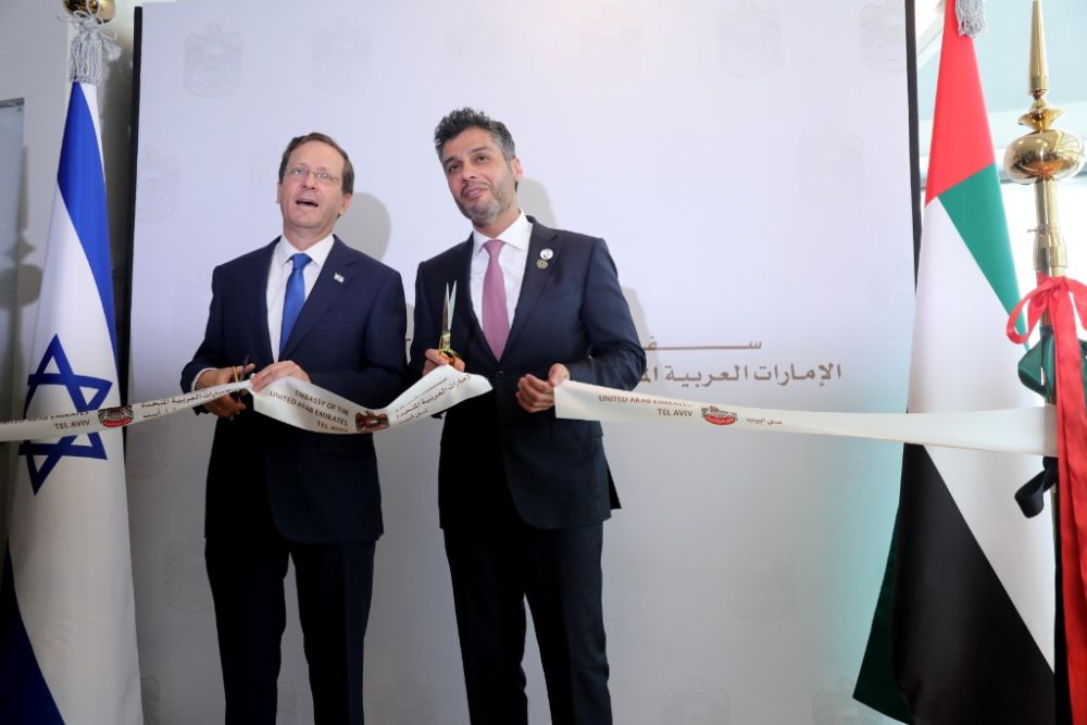7月14日,以色列总统赫尔佐格(左)和阿联酋驻以色列大使穆罕默德·哈贾在特拉维夫出席阿联酋驻以色列使馆开馆仪式。(新华社发,吉尔·科恩·马根摄)