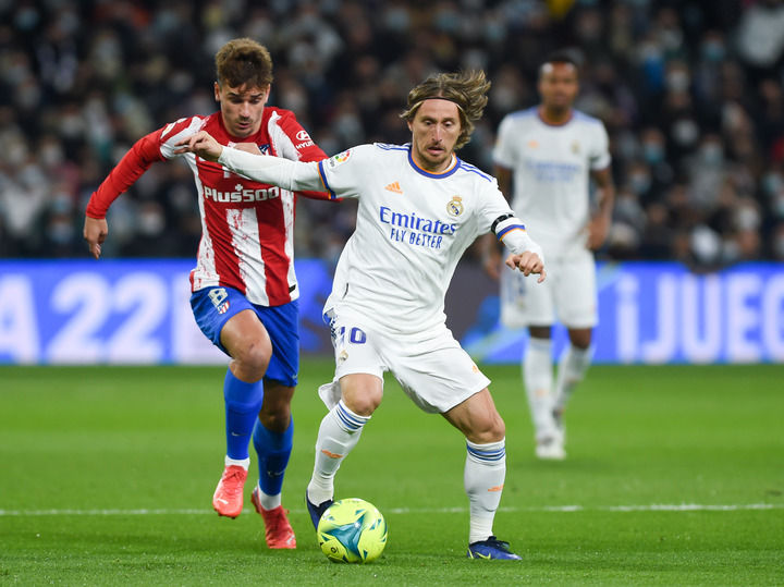 12月12日,皇家马德里队球员莫德里奇(右)与马德里竞技队球员格列兹曼在比赛中拼抢。新华社发(古斯塔沃·巴连特摄)