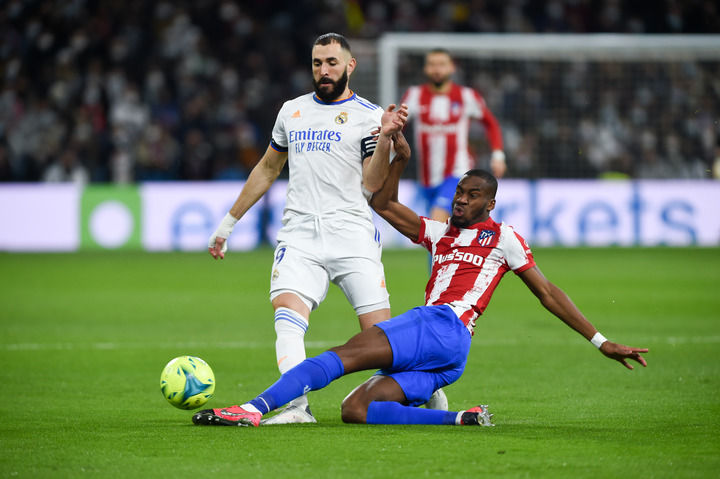 12月12日,皇家马德里队球员本泽马(左)与马德里竞技队球员孔多比亚在比赛中拼抢。新华社发(古斯塔沃·巴连特摄)