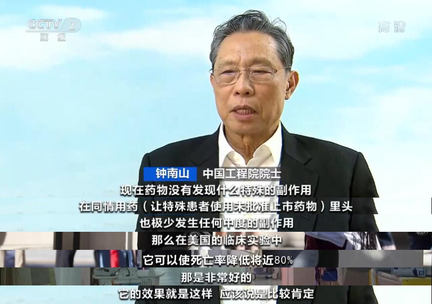 中国工程院院士钟南山主持开展了此次药物在中国的Ⅱ期临床研究,并牵头论证和推动了药物在我国的紧急救治工作,进一步验证了药物在中国患者中的安全性和有效性。