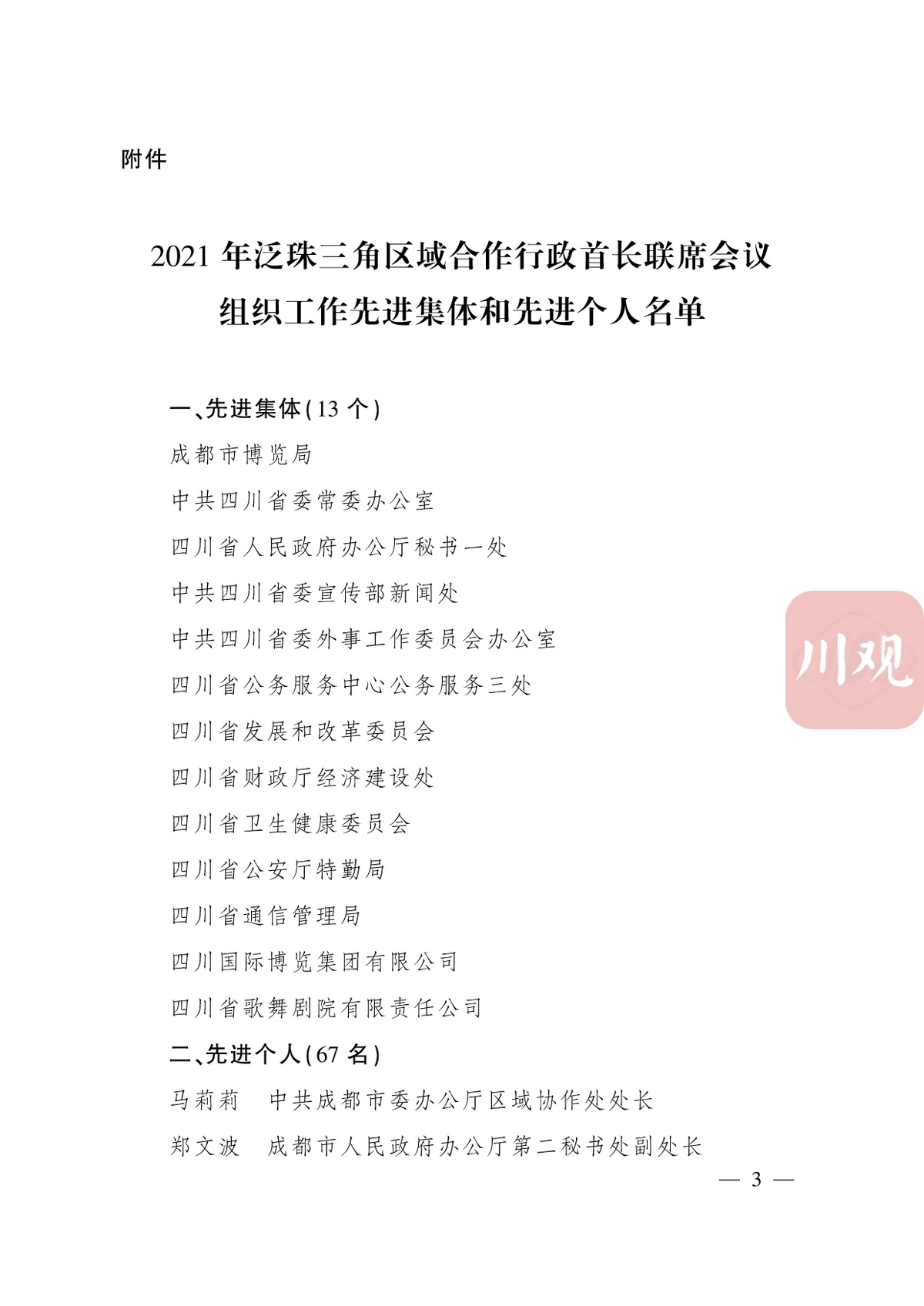 2021年泛珠三角区域合作行政首长联席会议(以下简称联席会议)于2021年9月在成都成功举办。联席会议立足新发展阶段、贯彻新发展理念、服务和融入新发展格局,聚焦推动高质量发展,促进内地9省(区)一体化发展,深化与港澳更紧密合作,取得丰硕成果。为表扬先进、宣传典型,进一步激发工作积极性和创造性,经省政府同意,决定对联席会议组织工作中表现优异的成都市博览局等13个先进集体和马莉莉等67名先进个人予以通报表扬。