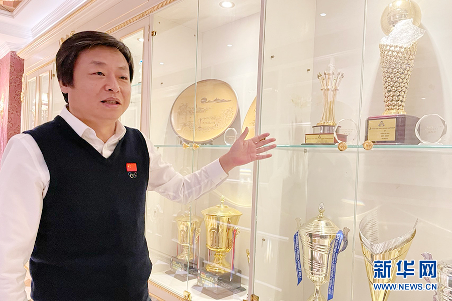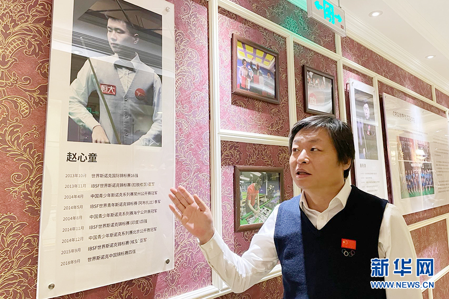 刘铮介绍CBSA世界斯诺克学院荣誉墙。新华网记者李旭摄