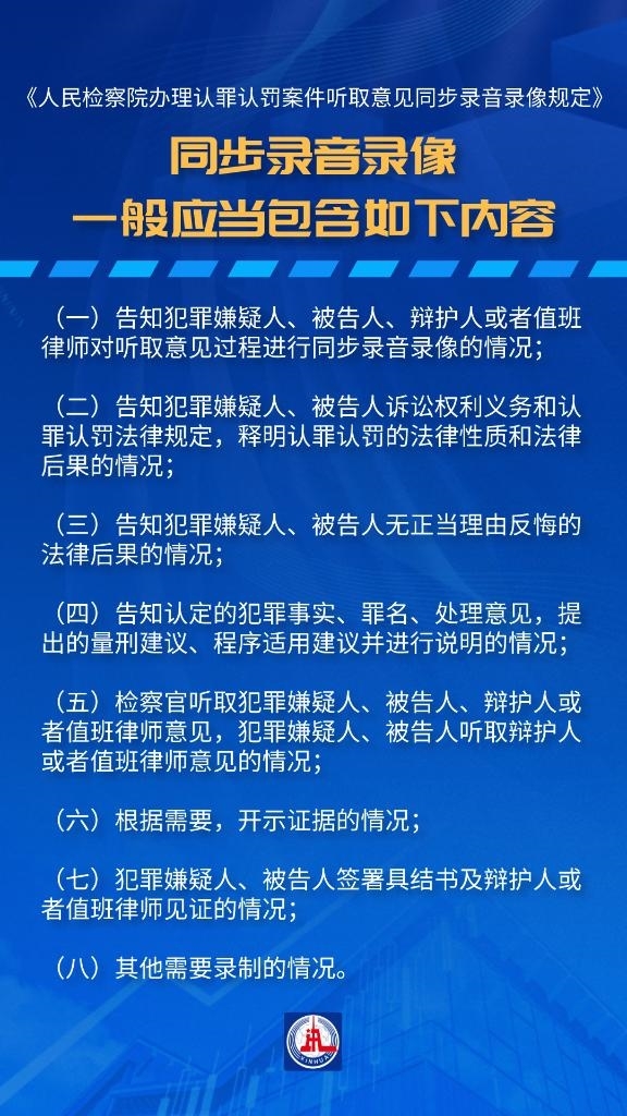 此次印发的规定共16条,明确了办理认罪认罚案件听取意见同步录音录像的目标任务、适用范围、录制内容、参与主体以及录音录像文件保管、使用规则等。